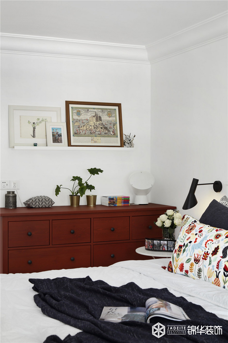 整個臥室空間以白色調為主,輔以恰到好處的醬紅色、木色等,再搭配以其他裝飾品等,讓整個空間看起來既寬敞舒適又格調十足。
