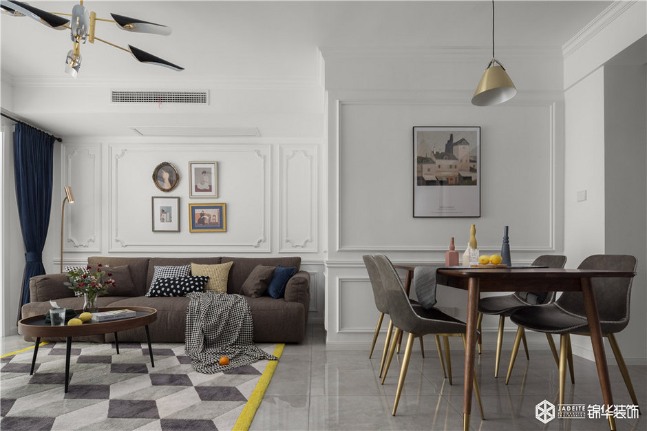 將陽臺空間納入室內,但因為原陽臺的梁無法拆除,如果將其全部遮蓋,客廳的整體高度會降低,設計師機智地做了一個美式經典的格子頂,美觀實用,然后加已線條做出層次使客廳空間看起來高挑。