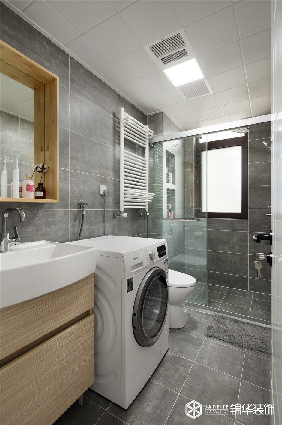 ▲衛生間雖然不大,但設計師還是做了簡單的干濕分離,同時還能放下洗衣機!